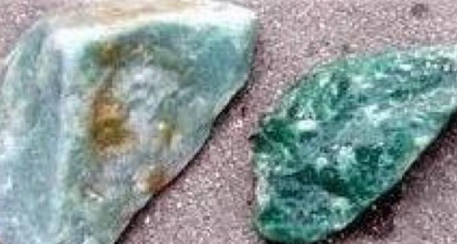 如图(c)为出产于危地马拉的翡翠,虽然也是翡翠,送去检测也是辉石玉,化学式、物理性质也一样,同样可以开证书,但没有透度不成玉,没有市场价值!因此,会有不肖的商人想办法将一颗不透明外观像大理石一样的辉石矿物,如图(d)用酸洗的方法浸泡,慢慢的使得辉石矿物的晶格被破坏,产生晶洞后再用环氧树脂灌进去,填满晶洞,这样就变成透明度高的翡翠,也就是B货。但是只有透明度还不够,如图(e)还要再用含氧化铬的化学物质侵蚀进入,才会产生绿色来,这种通称为C货,就更不值钱了!这种颜色跟天然翡翠颜色不同,凭肉眼就能分辨,通称为邪色,而真实翡翠的绿色,则可称呼为正色。