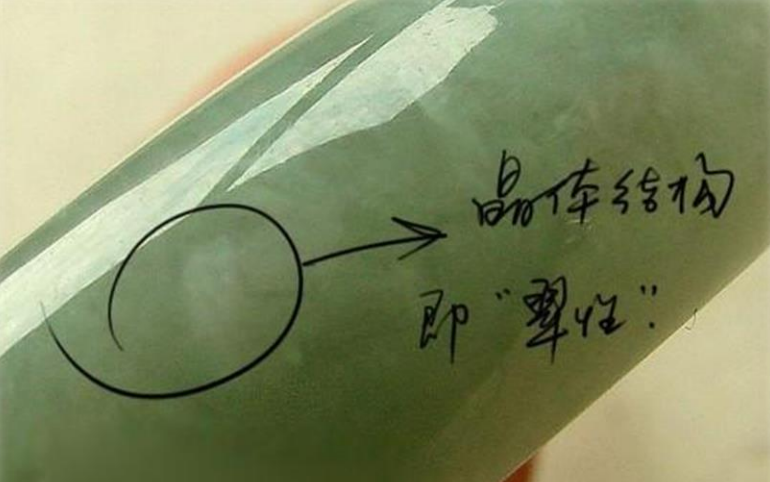 天然翡翠的会呈现一片片如「苍蝇翅」的结晶反射,这是别种矿物所没有的,也是翡翠独有的特性「翠性」,如图(a)。「翠性的结构特征」显示不论翡翠原料或成品,只要在抛光面仔细观察,通常可清楚看见结晶反光现象。「谈谈翡翠的翠性与纹路」也显示出翡翠结晶的独特性,一般用肉眼就能清楚的辨识,其特征是会有一片一片结晶会对光的反光,这是翡翠主成份钠辉石的结晶折射反光特性,如图(b)。